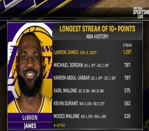 NBA常规赛得分连续上双榜:詹姆斯1297场居首,乔丹866场第二