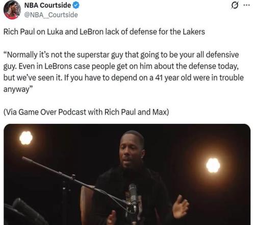 里奇保罗说道:“通常来说,超级巨星不一定是防守悍将,哪怕是詹姆斯这种球员,也会被外界批评防守表现,但事实是一支球队如果想要依赖一名41岁的老将来防守,那么他们肯定是遇到大麻烦了。”