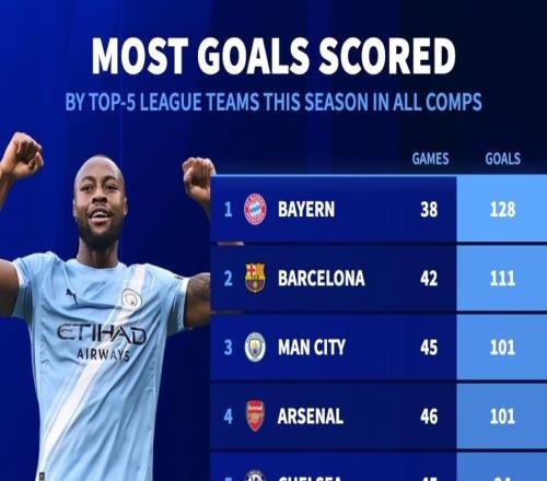 本赛季五大联赛球队进球榜:拜仁128球第1,巴萨第2,曼城第3 -